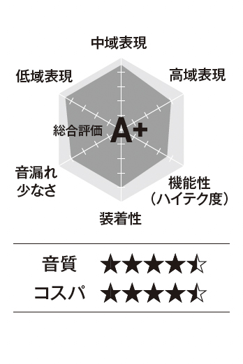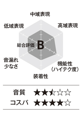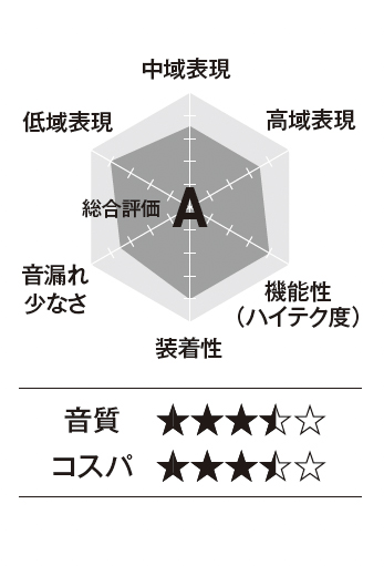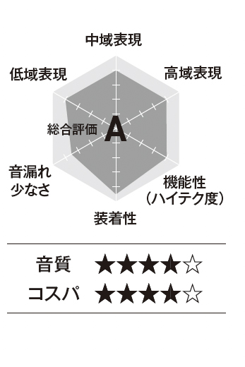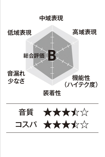 超極細チタンワイヤー、リキッドシリコン素材の柔軟性でフィット感を確保したうえで、フックを角度調節でき、本体と耳との位置を最適化できます。左右フックを重ねて収納するためケースも小型。アプリ設定による操作割り当ての自由度が高いです。ドライバーは大口径で、低音を盛大に膨らませた音作りは好みがわかれそうですが、アプリで「カスタムEQ」をオンにするだけでフラットに激変。チャートはその状態での評価。音漏れは高域よりもボーカル帯域を中心に漏れやすいです。