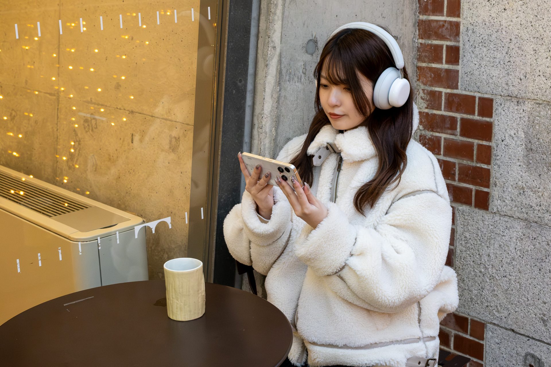カフェで動画を楽しむのにも、ノイズキャンセリングが役立ちます。