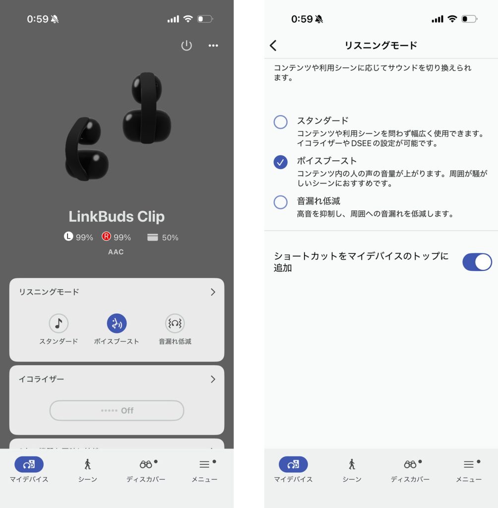 なかでも、YouTubeなどの動画視聴をよくする方にぜひ試してほしいのが「ボイスブースト」モード。これをオンにすると、コンテンツ内の人の声だけがグッと一歩前に近づいてくる感覚があり、驚くほど言葉が聞き取りやすくなります。私自身が特に効果を感じたのが移動時の騒音環境下。耳を塞がないからこそ周りの音が大きいと声が埋もれてしまいがちなんですが、それが一切ない。通勤や通学時に電車のなかで動画を観る、という方には本当に使って欲しいモードです。