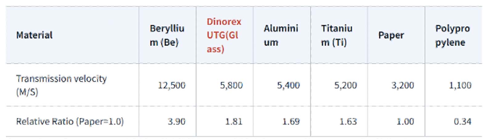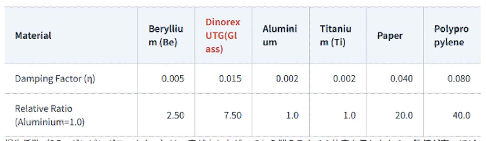 軽量な素材ほど、音の反応が早くなります。この数字は紙を1.0とした時の比較です。ガラスはアルミよりも軽量です。