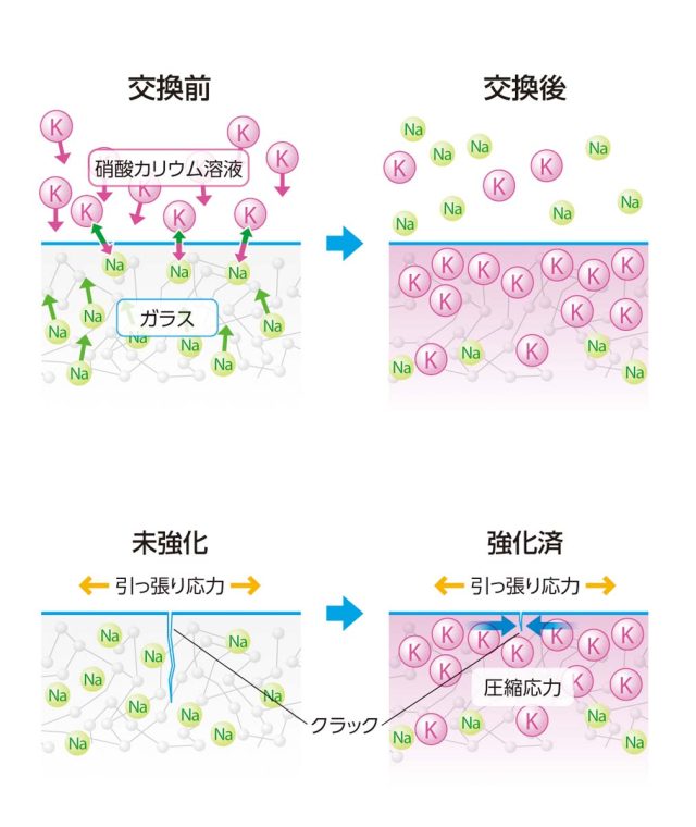 UTG振動板に使われているDinorex UTGは、空気ではなく化学変化の力で強化処理を行います。ナトリウムイオン(Na+)を含んだガラスをカリウムイオン(K+)を含む硝酸カリウム溶液に浸すという化学処理を施すことで、表面を強化層に変化させているのです。窓板ガラスも同じアルカリガラスの一種ですが、UTGは化学強化特性に優れ、内部構造の自由度が高く大きな減衰(損失係数)を示すため振動板に適しています。