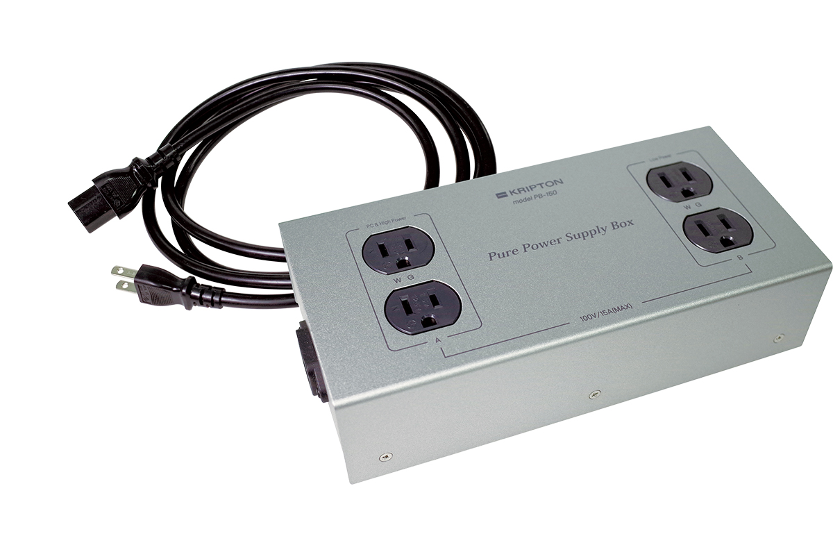 • 写真はクリプトンの電源タップ「PB-150」(¥42,900/税込)。上級機で開発してきたノウハウやパーツを投入した普及価格帯モデルです。同社の上位モデルである「PB-HR1500」と同様の2回路電源フィルター回路構成も採用しています。