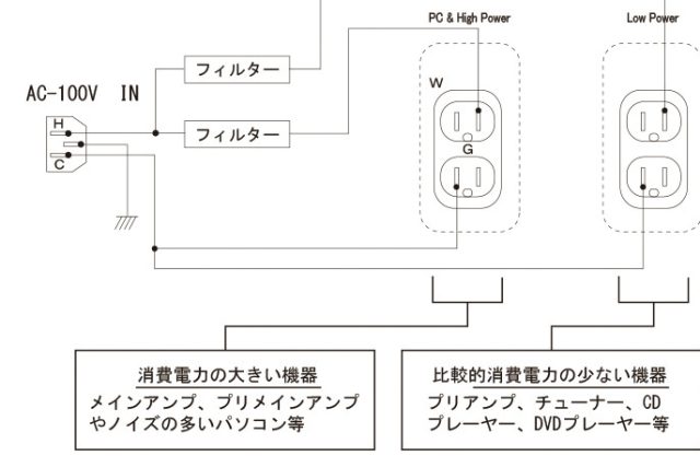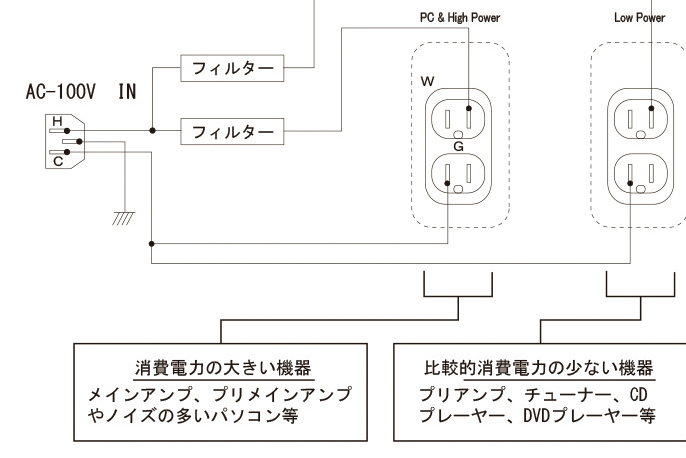 • クリプトンの「PB-150」は、「大電流機器・高ノイズ機器」と「小電流機器」の回路を分け、機器間の相互干渉をなくしています。